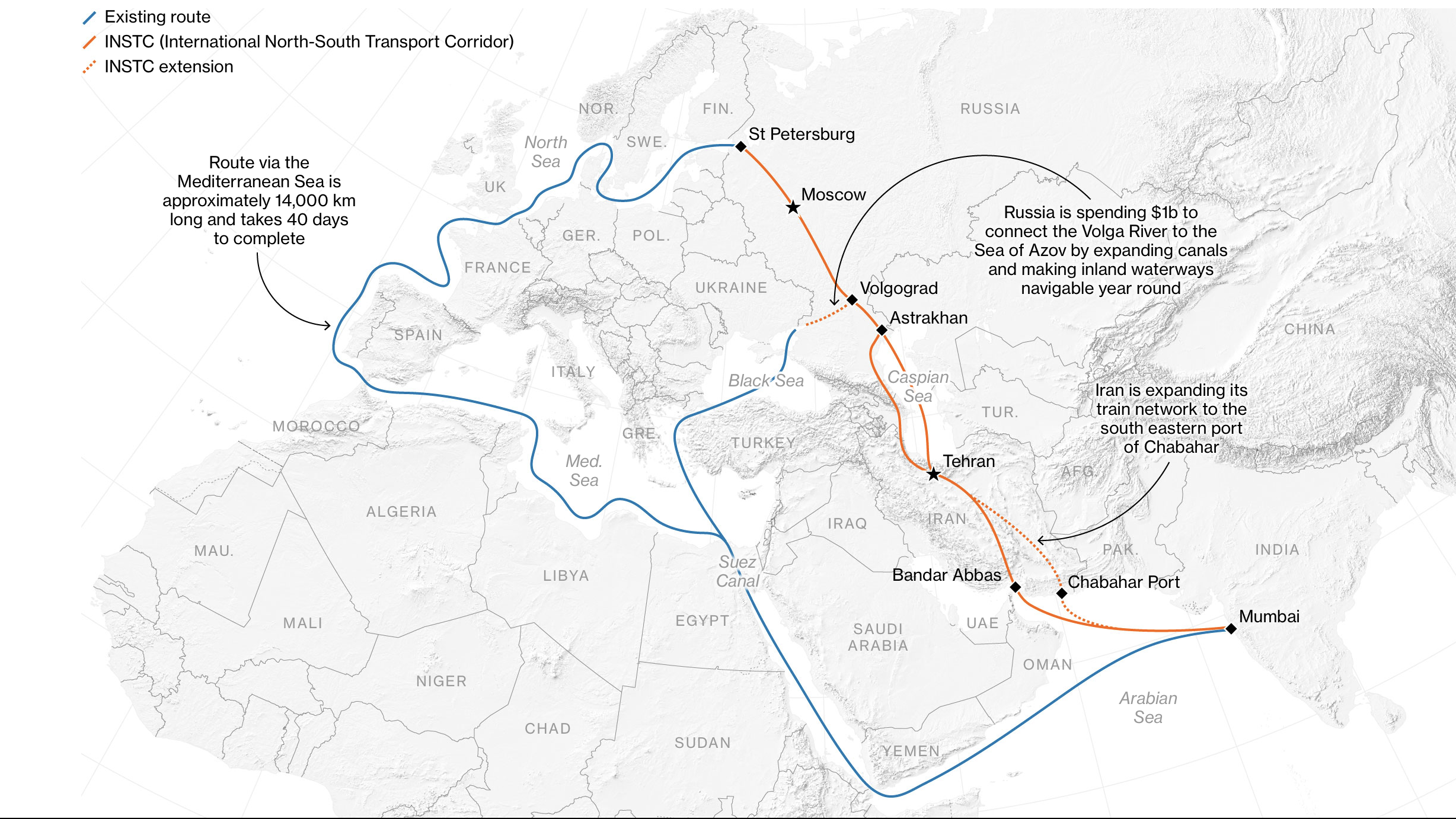 The two countries are spending billions of dollars to speed up the delivery of cargos along rivers and railroads linked by the Caspian Sea. Ship–tracking data compiled by Bloomberg show dozens of Russian and Iranian vessels, including some that are subject to sanctions, already plying the route.