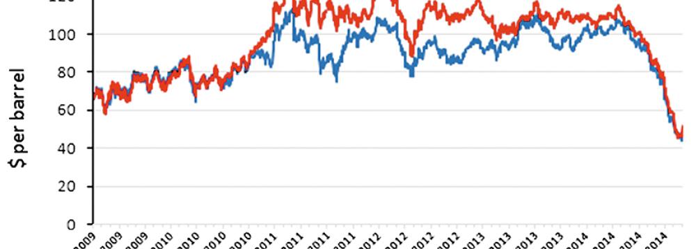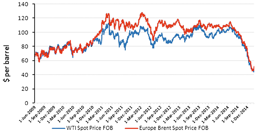 After nearly five years of stability, the price of a barrel of Brent crude in Europe fell from over $100 on September 2014 to less than $49 on August 2015.