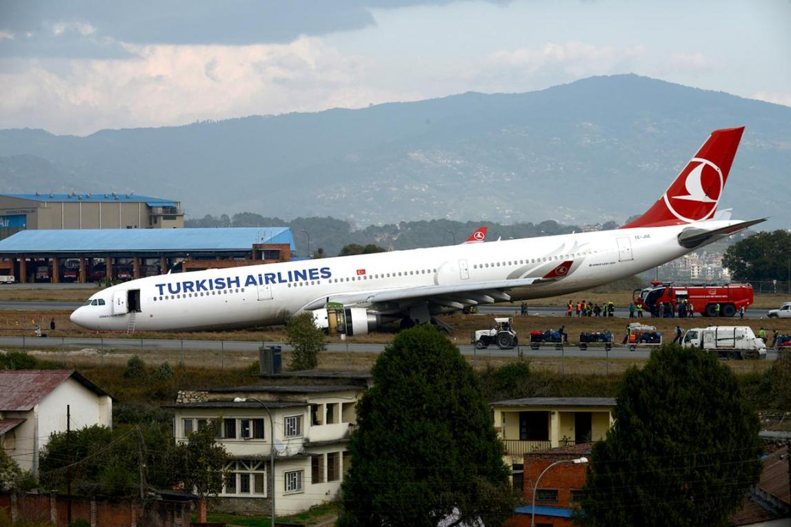 A Turkish Airlines jet landing in dense fog in the Nepalese capital Wednesday skidded off a slippery runway, but there were no serious injuries, officials said.