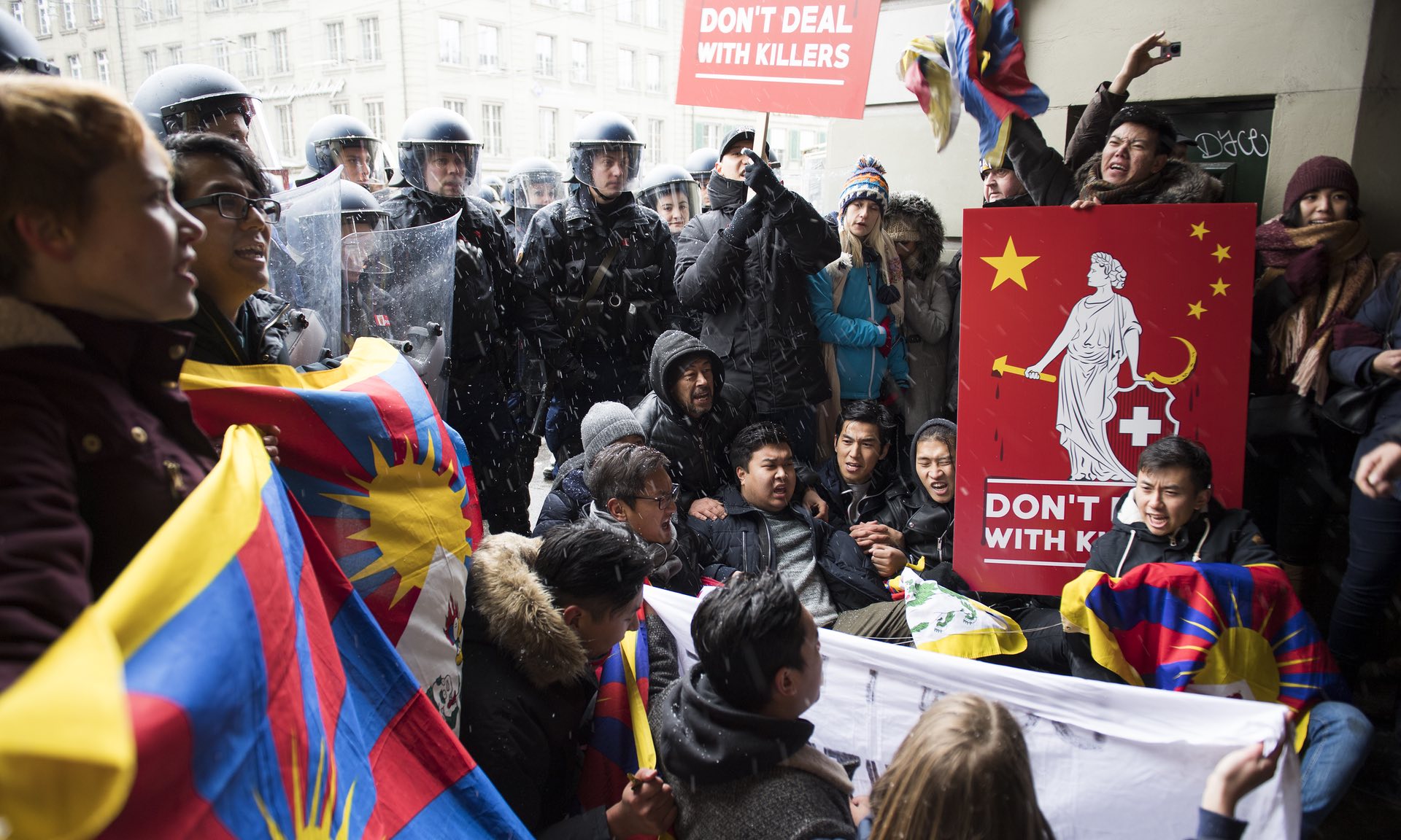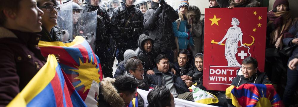 Fourteen activists were detained near the Swiss Parliament building in the afternoon as they continued to protest past the time restriction, waving posters saying “Free Tibet” and “Don’t Deal with Killers”, the Association of Tibetan Youth in Europe said.