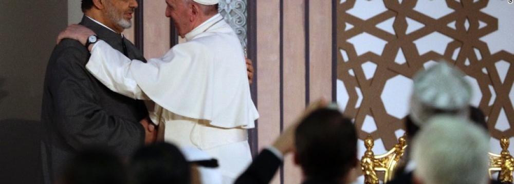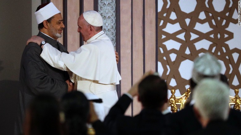 Pope Francis, speaking at the heart of Sunni Islam scholarship, stressed the importance of unity between Muslims and Christians to shape world peace and emphasized the “incompatibility of violence and faith.”