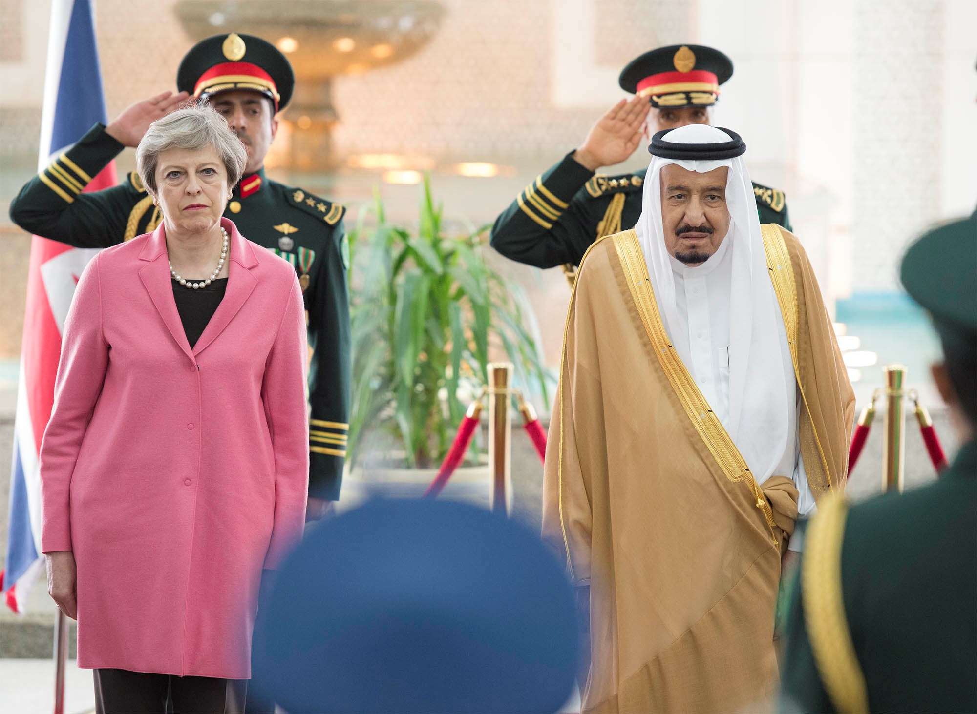Caption: Saudi Arabia’s King Salman bin Abdulaziz Al Saud stands next to British Prime Minister Theresa May during a reception ceremony in Riyadh, Saudi Arabia on April 5.