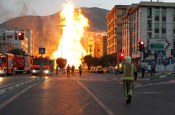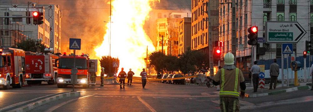 A huge fire in the early hours of Friday as a result of an explosion at a gas pipeline in northwest Tehran’s Shahran District was brought under control by the Fire Department and Emergency Services after battling the inferno for two hours.